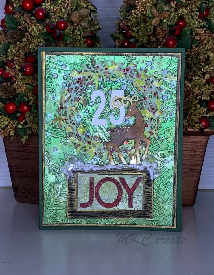 The JOY, deer and #25 were all cut from the Cricut. Joy was cut out of red card stock and inked with Black Soot Distressed Oxide. Then fine red glitter and Clear Texture Paste from Range were placed over the letters. #25 was embossed with Ranger embossing dauber and Marshmallow embossing powder from Emerald Creek. The deer was colored with Distressed Oxide Walnut Stain and Gathered Twigs. Then details were added to the deer with Prismacolor pencils along with some white and black gel pens.