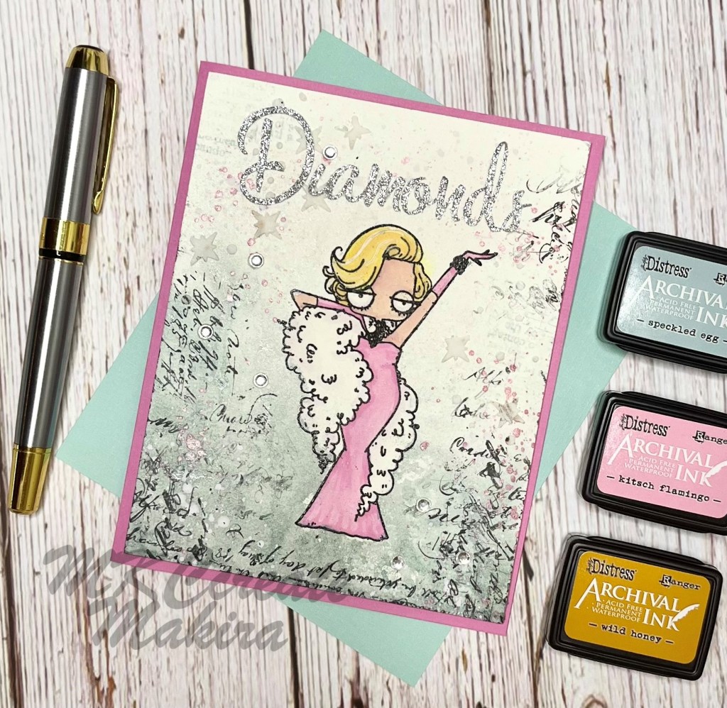 Stamp Marilyn in Archival Ink twice and then with Versamark. Emboss with Black Cherry powder. Color using a water brush and Distress Oxide Ink “smooshed” onto a working surface. Allow to dry and place micro glaze over Marilyn. Spray with water and the Distress Ink sprays until you are happy with the color. Heat dry or air dry. Splatter with Picked Raspberry and white gouache. Add the texture paste through the stencil and allow it to air dry. Randomly stamp with Archival Speckled Egg using SSS’s Good Reading stamp. Randomly stamp with Archival Black Soot using Tim Holt’s Ledger Script CMS24. Add sentiment and jewels. Mount to white fun foam and add to the card front.
